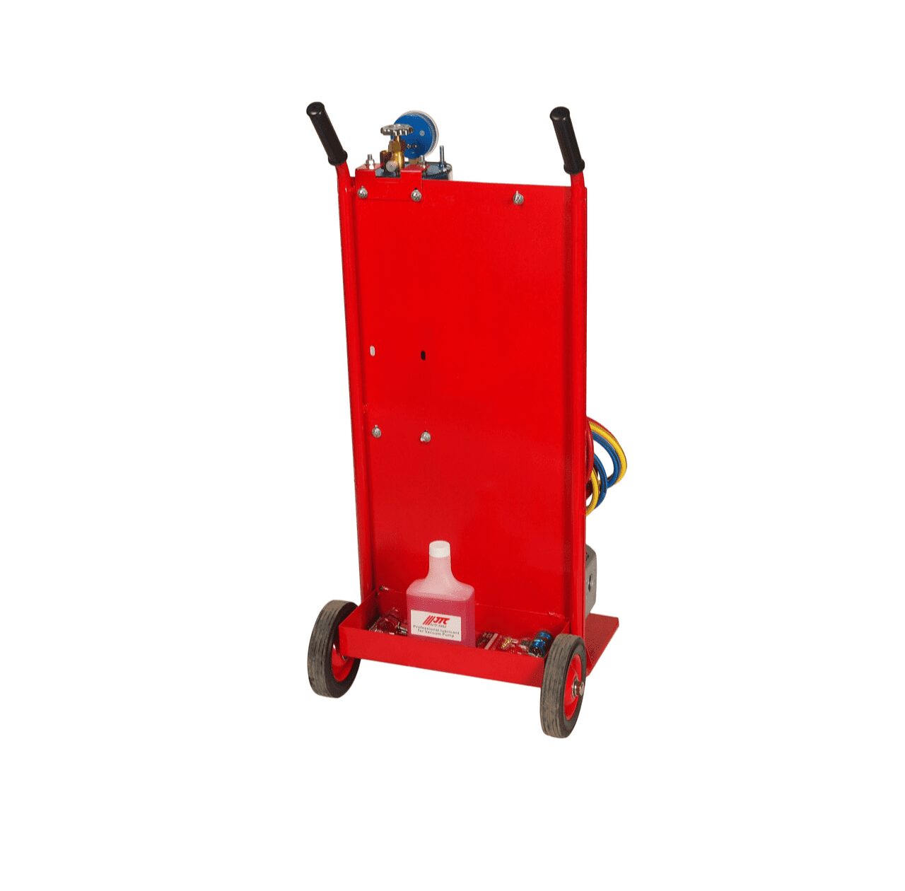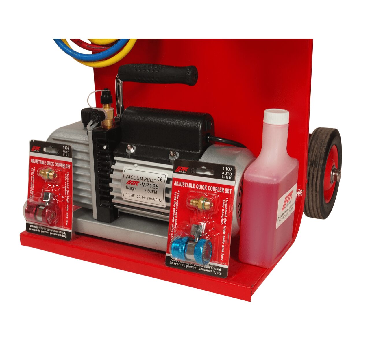 - Устройство для заправки автокондиционера JTC-1105, включающее: соединители быстросъемные (JTC-1107) для линий высокого (красный) и низкого давления (синий) — по 1 шт. каждого.