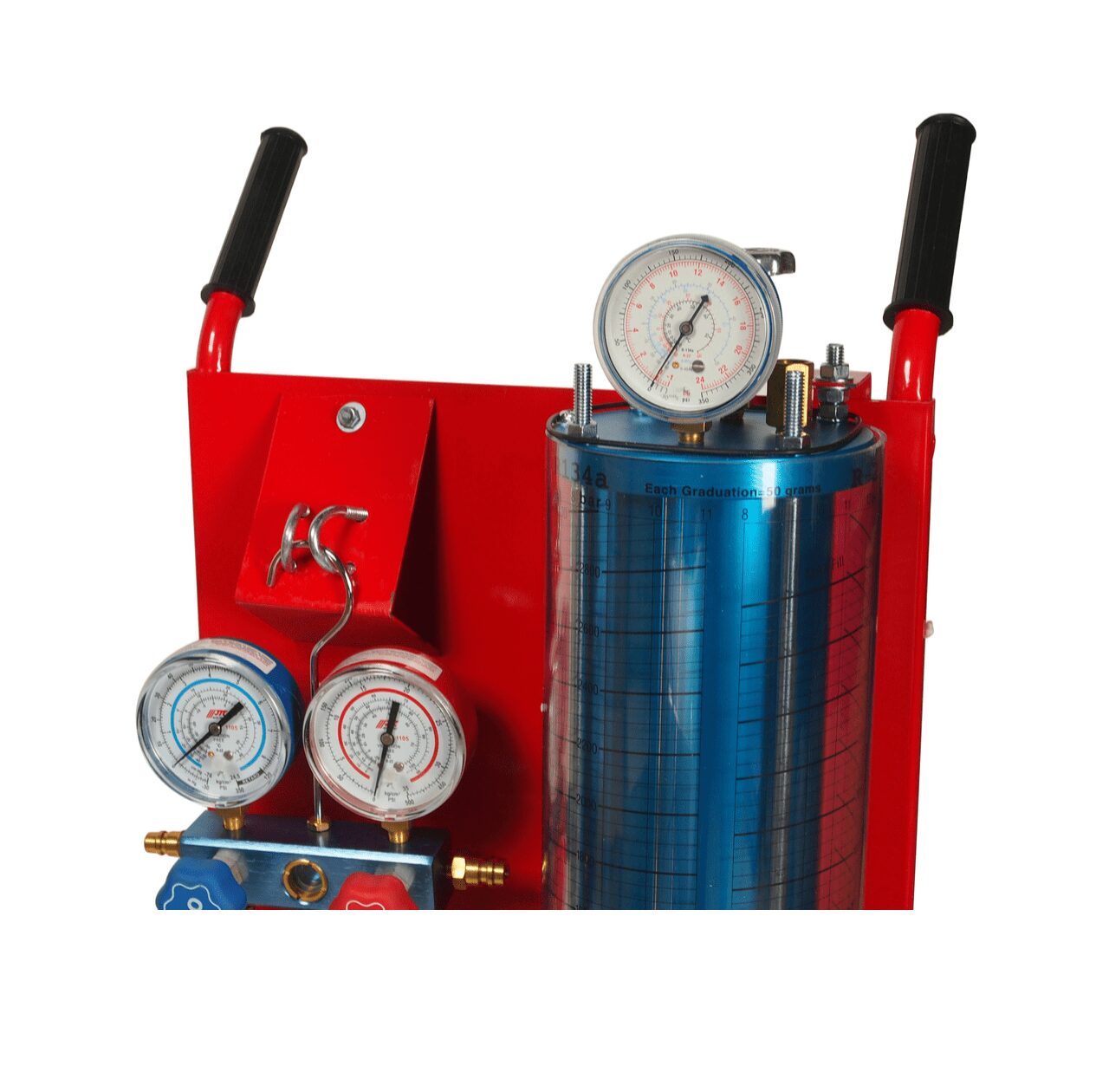 - Заправочный цилиндр JTC-1219 (емкость 3200 гр.) с метками и манометром для контроля фреона — 1 шт.