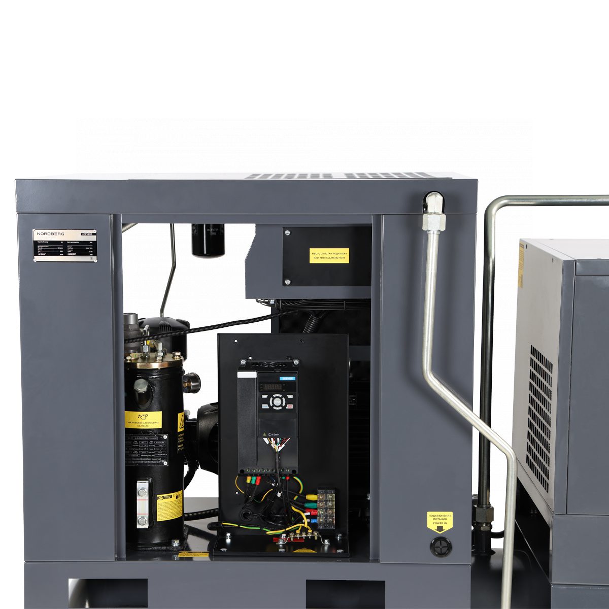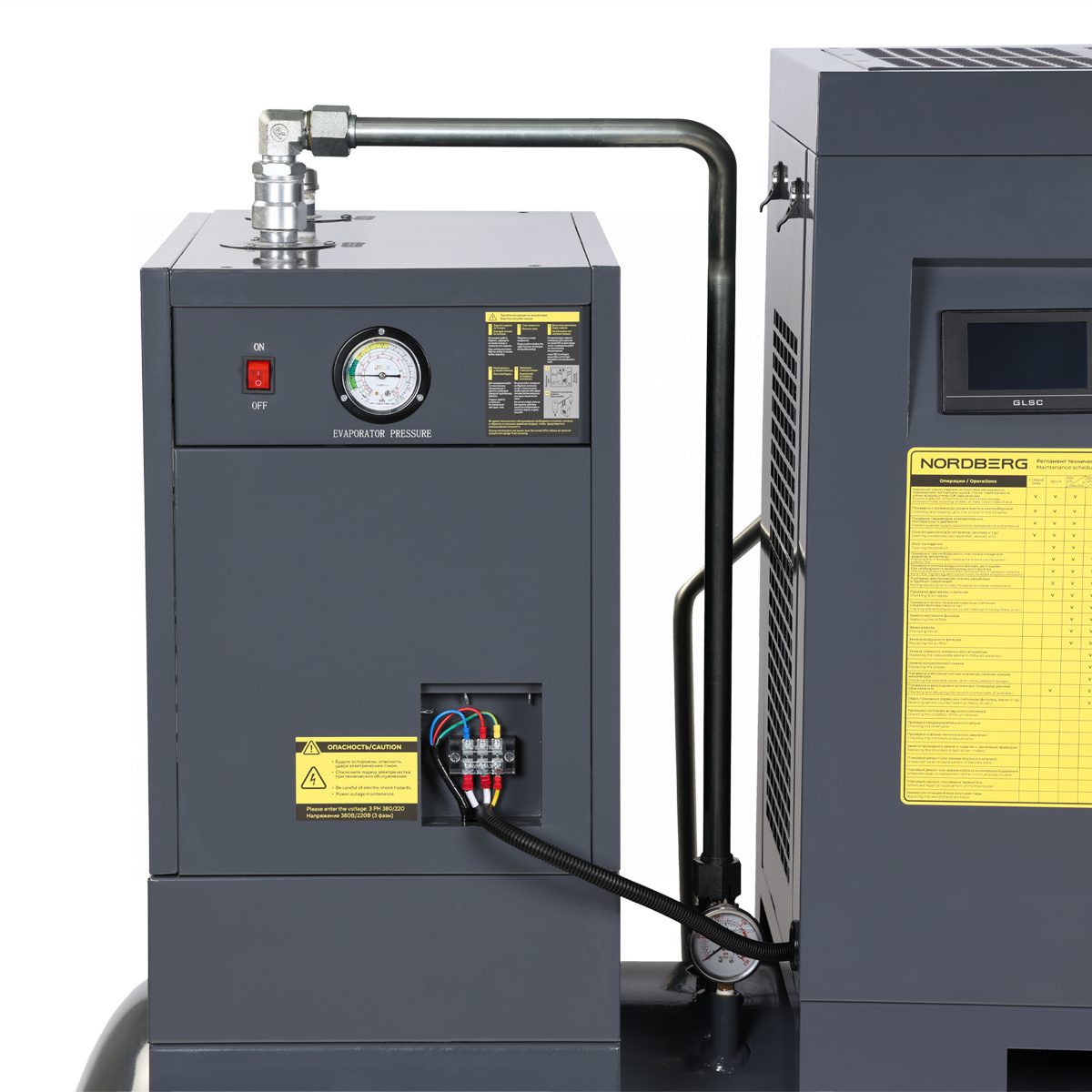 - Прямой привод с муфтой и высоким КПД — эффективность до 90%, что в 1,5 раза выше, чем у поршневых компрессоров. Обеспечивает снижение шума, вибрации и пусковых нагрузок;