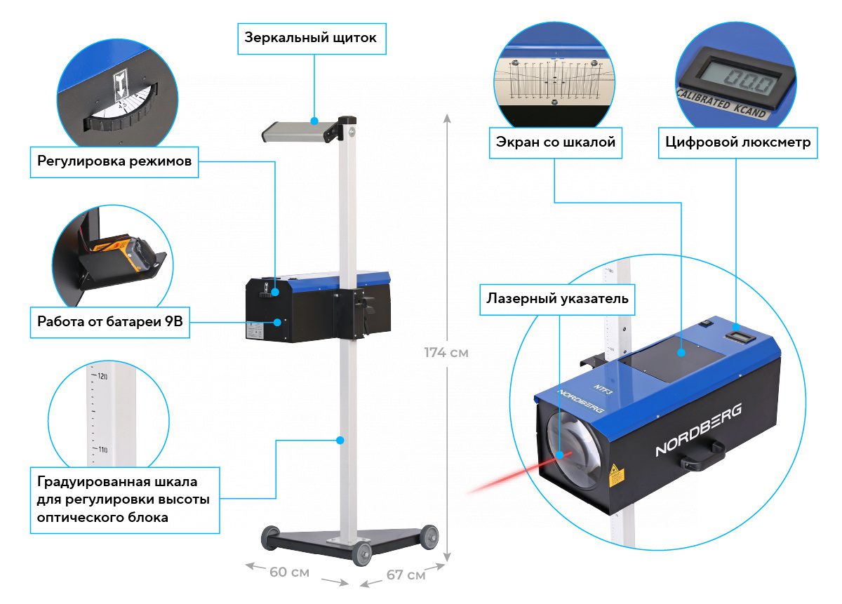 Прибор для проверки и регулировки светового потока фар, линза из стекла, лазерный указатель