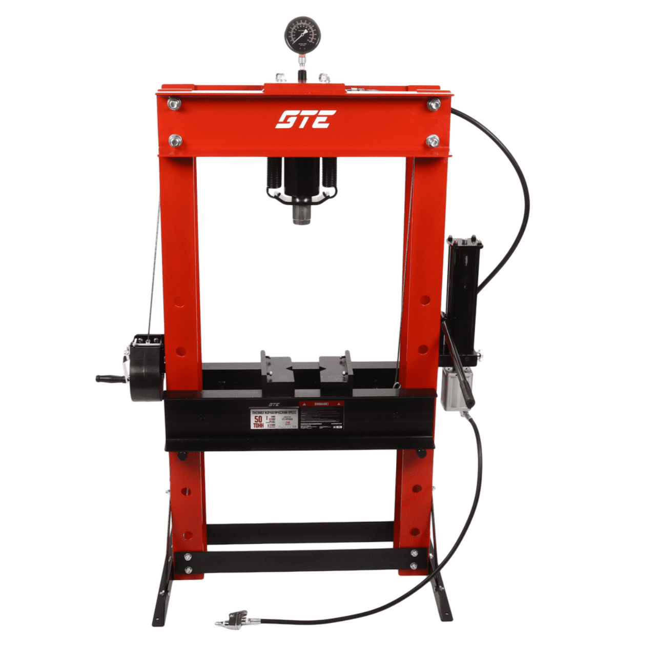 Профессиональный пневмогидравлический пресс с усилием 50 тонн предназначен для выпрессовки, запрессовки и других операций с деталями в автосервисах, СТО и на промышленных объектах. Пресс оснащен ручным гидравлическим приводом и пневматическим насосом, который работает от источника сжатого воздуха, ускоряя выполнение операций.
