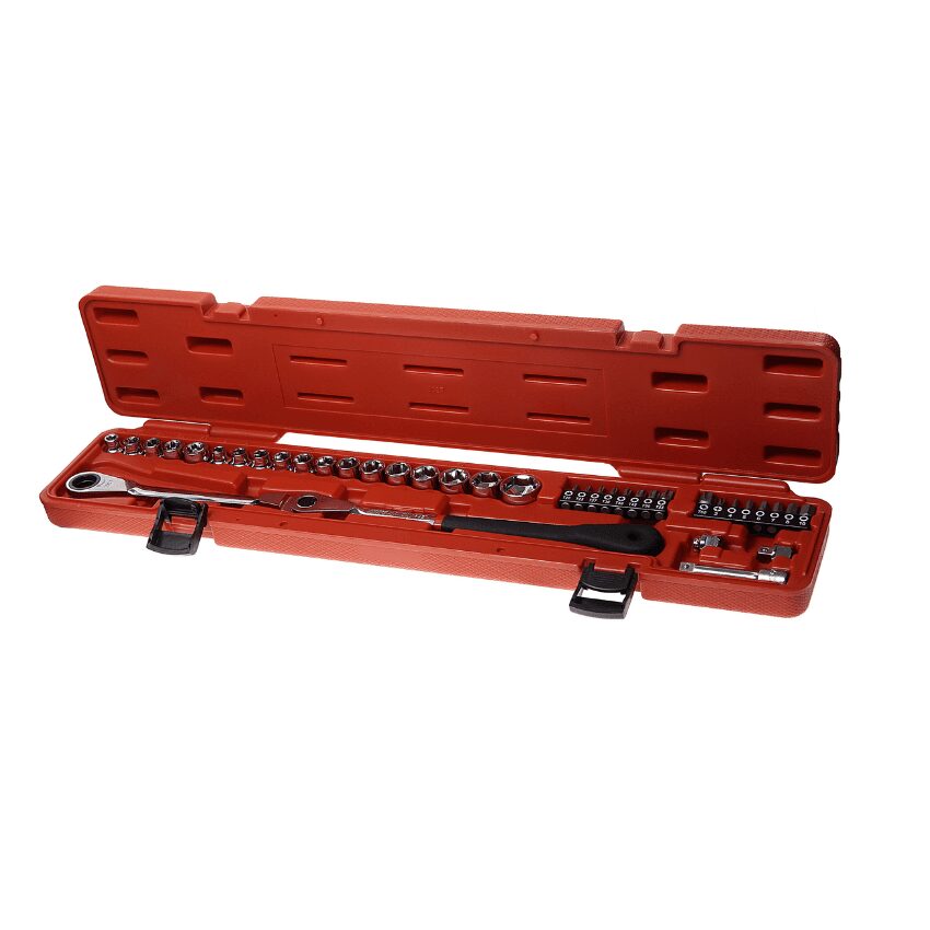 Трещотка — 100 зуб., длина 500 мм, регулируется на 180°. 18 шт. диаметром 3/8`х17 мм, мини-головки длиной 24 мм: Е10, Е12, Е14, Е16, Е18, 8, 9, 10, 11, 12, 13, 14, 15, 16, 17, 18, 19, 24 мм. 16 шт. 5/16`х 30 мм