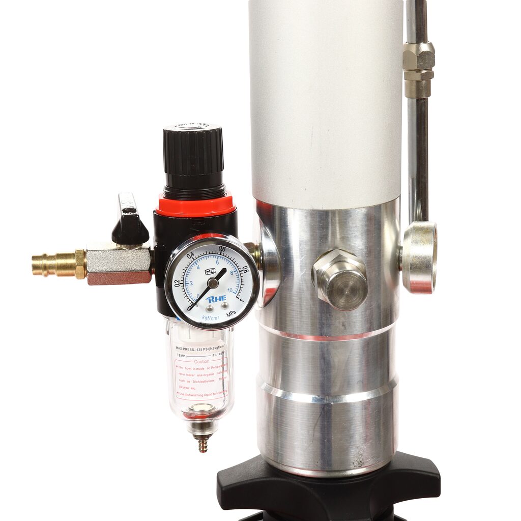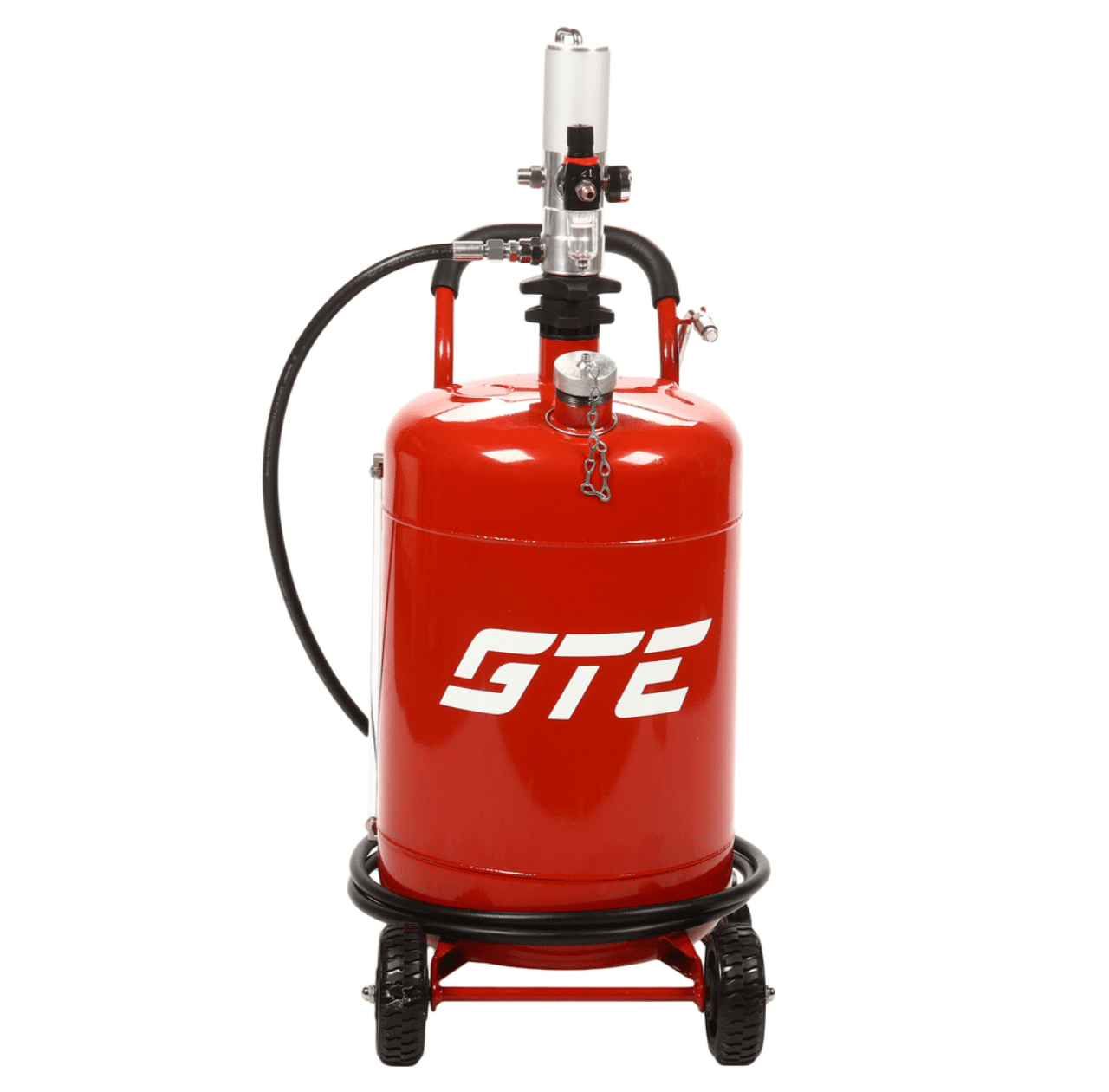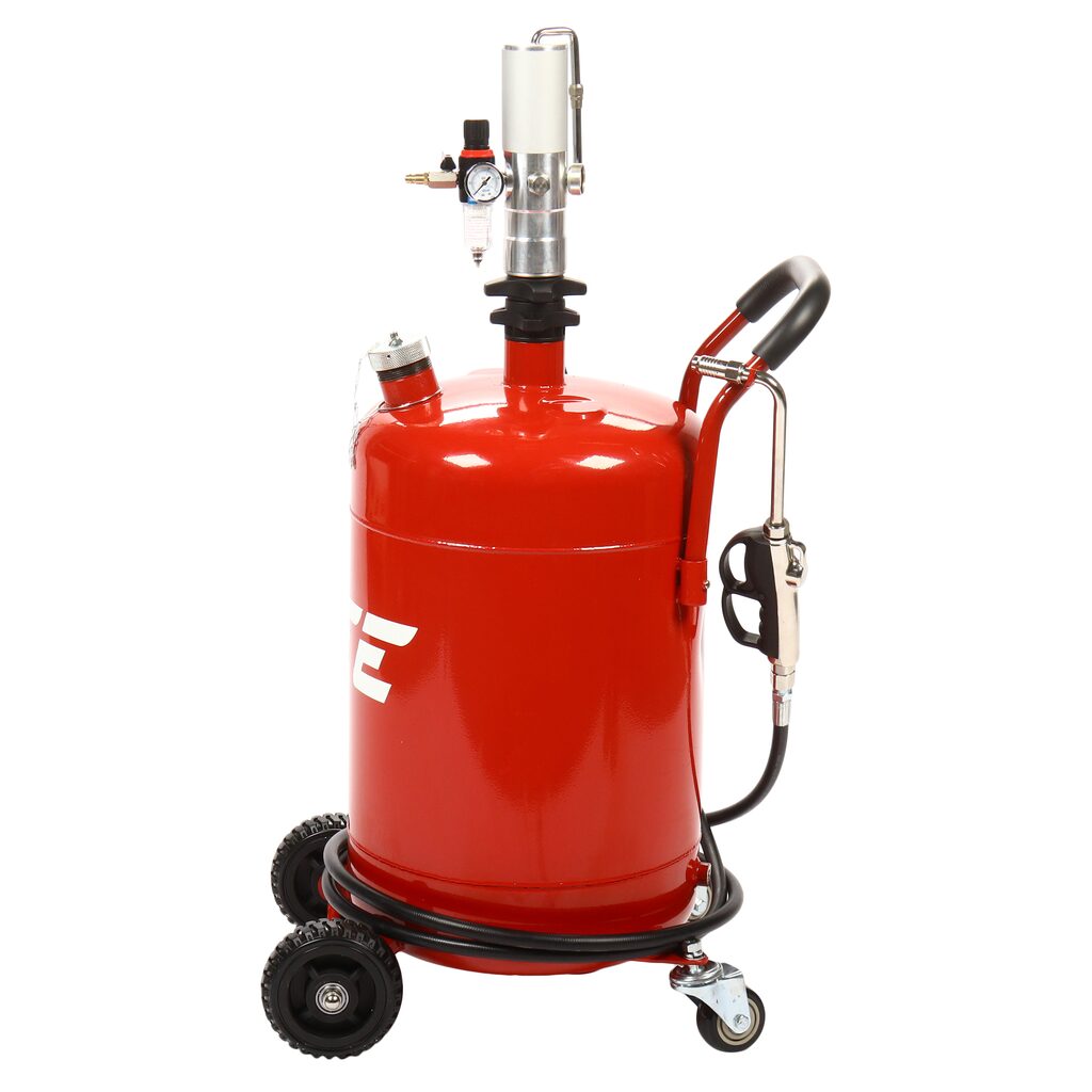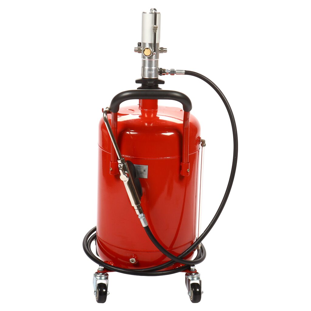 Стальная емкость объемом 70 л, c ручкой для удобства перемещения в помещении автосервиса, оборудована пневматическим насосом, который создает давление, необходимое для подачи масла и сходных материалов.