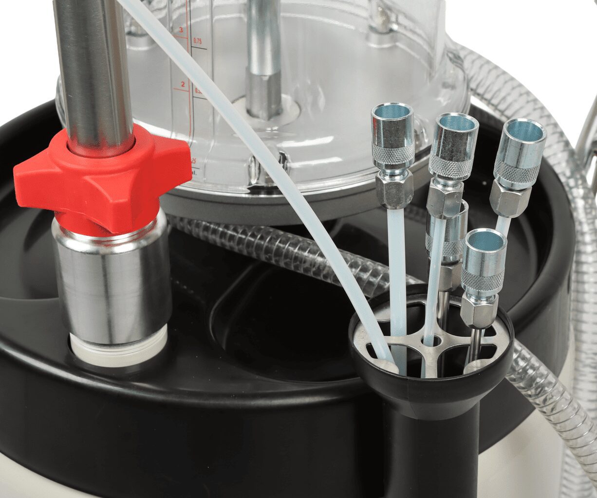- Замена масла производится как самотеком с использованием маслосборника (15 литров) с регулируемой высотой, установленного на боковой опоре, так и путем откачивания при помощи прилагаемых щупов, идущих в комплекте.