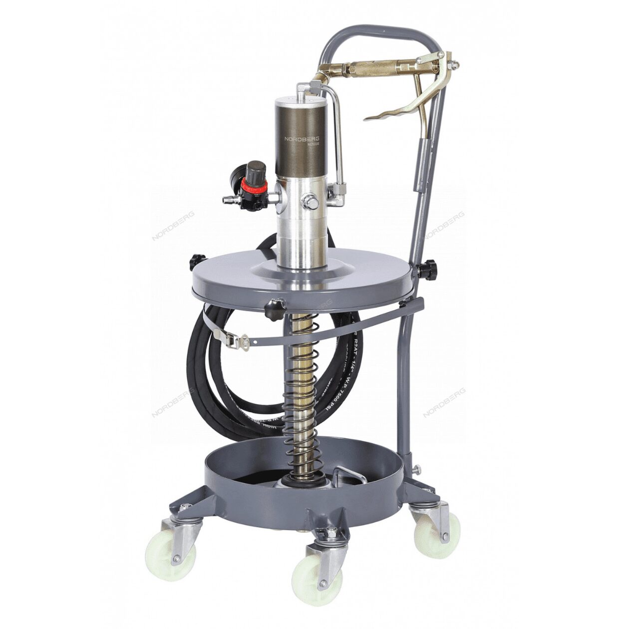 Пневматическая установка для раздачи густой смазки из бочек NORDBERG NO5016 – специальное оборудование для обслуживания узлов и агрегатов в автосервисах, транспортных и других предприятиях, занимающихся обслуживанием и ремонтом транспортных средств и другого оборудования.